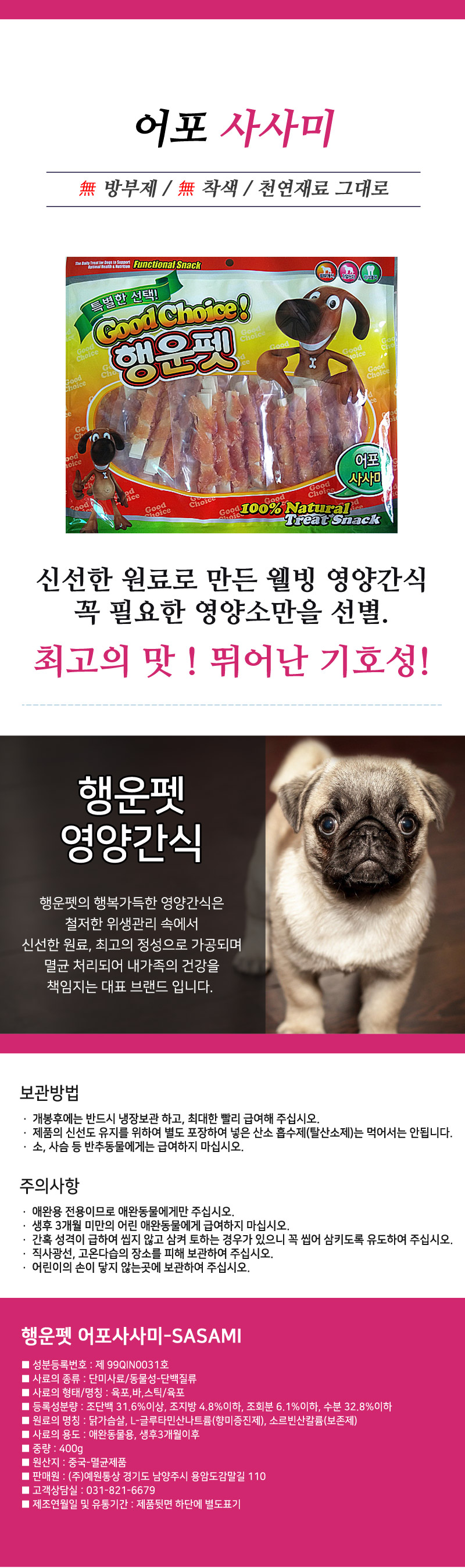 [강아지간식] 행운펫 어포사사미 400G 1+1 요약정보 및 구매