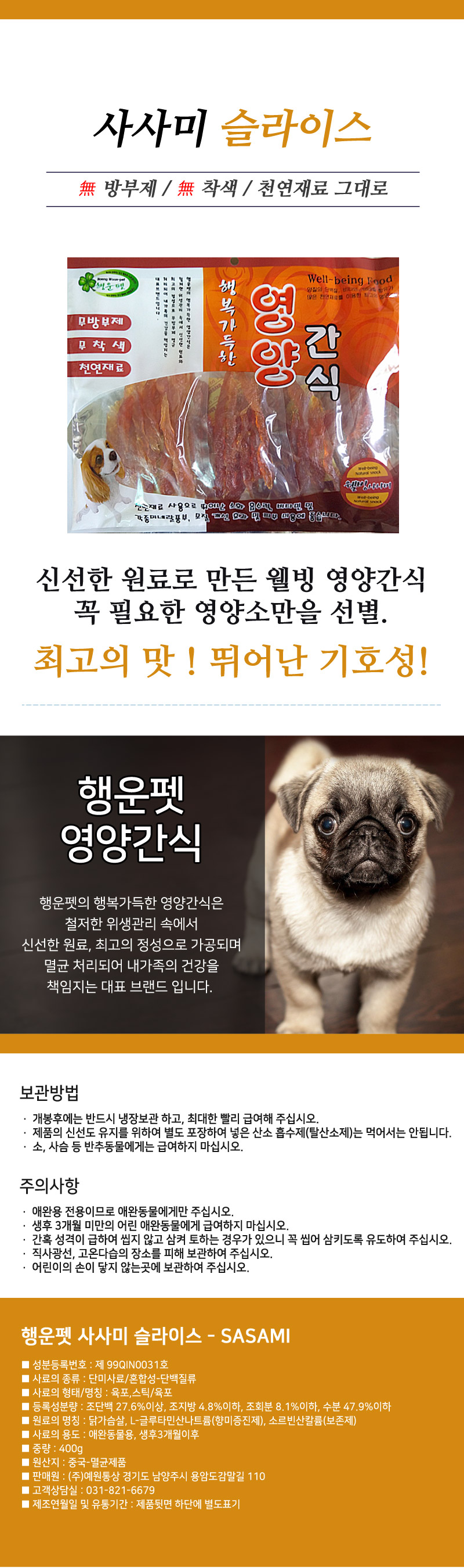 [강아지간식] 행운펫 사사미 슬라이스 400G 1+1 요약정보 및 구매